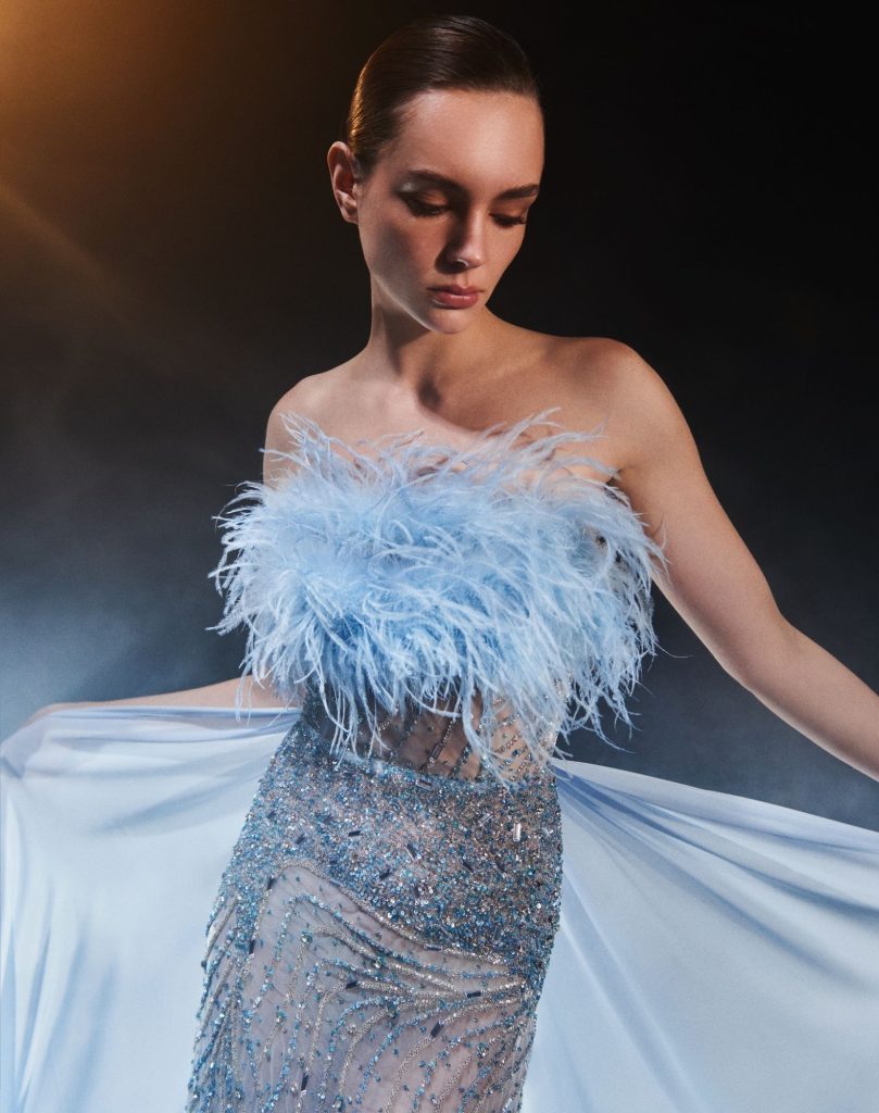 İpek, şifon ve krep kumaşların akışkanlığı, kasnakta elde işlenmiş nakışlarla zenginleşiyor. Her detay couture işçiliğinin inceliğini yansıtırken, pastel tonların yumuşaklığı ve siyahın asaleti büstiyerler, pantolonlar, tulumlar ve pelerinli elbiselerle hayat buluyor. Feminen çizgiler, modern bir dinamizm ve çok yönlülükle yorumlanıyor.